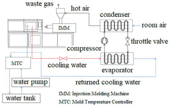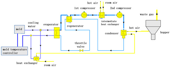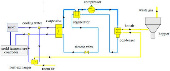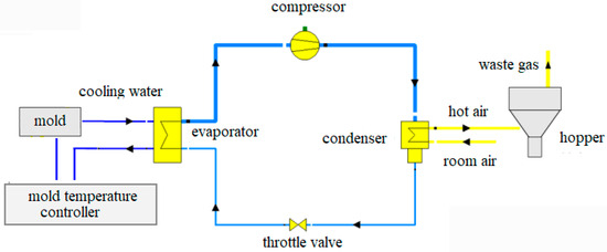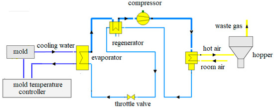 A critical yet underexplored issue in injection molding is the significant latent heat released during the mold cooling process. This wasted heat contributes to energy losses and environmental inefficiencies. The temperature of waste heat generated in the molding process of materials in the injection-molding machine is usually lower than 100 °C, which belongs to low-temperature waste heat recovery. In industrial waste heat, waste heat below 100 °C accounts for 63% of the total amount of low-temperature waste heat. It is a major energy that has not yet been developed sufficiently. At present, there is no cost-effective commercial solution [21,22,23,24]. Moreover, in the injection-molding production system, there has been a lack of research on the coupling relationship among mold cooling, heat pumps, and material preheating. Therefore, this paper proposes an integrated energy management system for injection-molding machine mold cooling/heat pump/material preheating. This system employs a heat pump to recover heat from the mold cooling water and generate hot air for preheating the raw materials. This paper investigates the coupling characteristics among mold cooling, heat pumps, and material preheating. It also optimizes the coupled cycle system and corresponding thermodynamic parameters. Based on this, the applicability of various refrigerants in this system is studied. Consequently, the optimal cycle configuration, operating parameters, and most suitable refrigerants are obtained, providing theoretical support for engineering practices aimed at energy conservation and consumption reduction in injection-molding equipment.