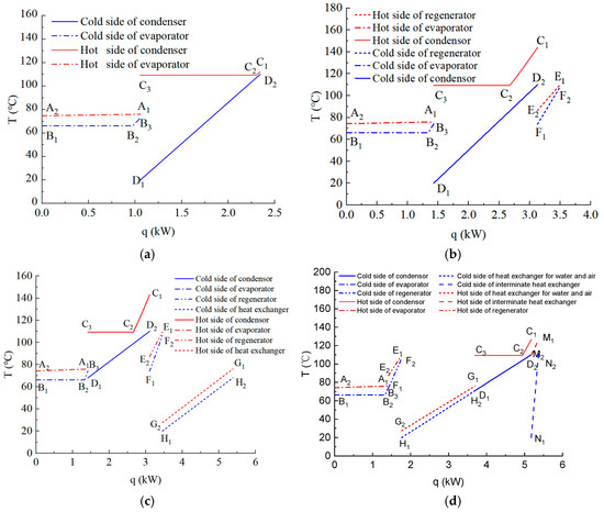 Temperature vs. transferred heat of components for the four systems. (a) MC/BHP/MPCC. (b) MC/RHP/MPCC. (c) MC/HP/MP-IEMS. (d) MC/DCHP/MP-IEMS.