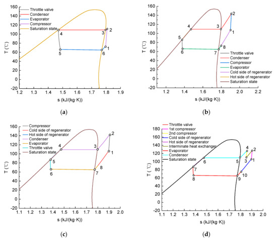 Temperature vs. entropy for the four integrated energy management systems. (a) MC/BHP/MPCC. (b) MC/RHP/MPCC. (c) MC/HP/MP-IEMS. (d) MC/DCHP/MP-IEMS.