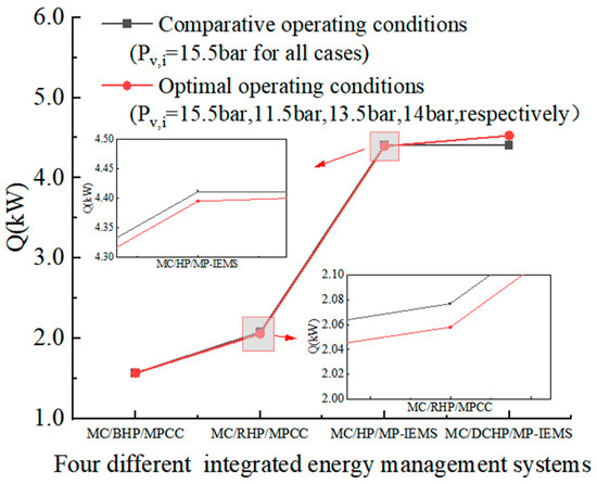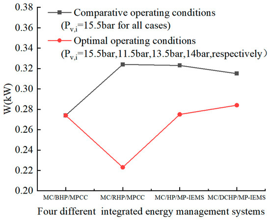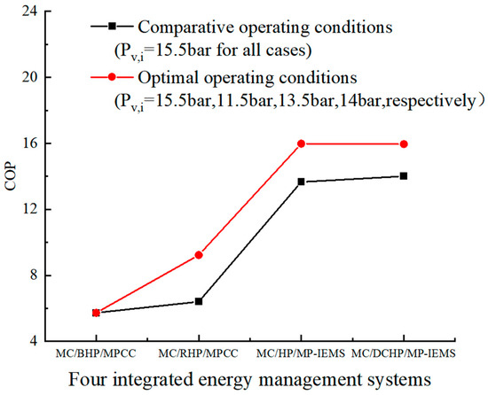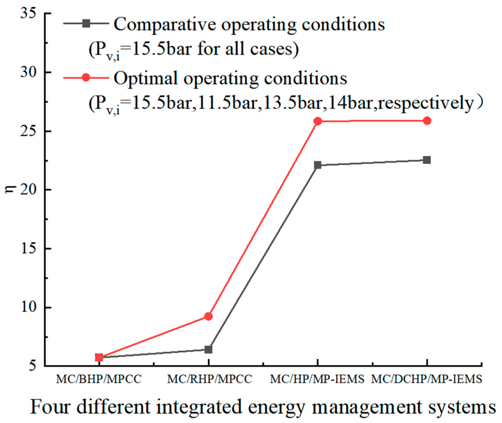 - The paper compares energy consumption, heat production, COP, and whole cycle energy efficiency of different integrated energy management systems using MC/HP/MP-IEMS as an example, under both comparative and optimal conditions. In MC/RHP/MPCC, MC/HP/MP-IEMS, and MC/DCHP/MP-IEMS, the optimal condition is obtained when the outlet pressure of the throttle valve is 5.5 bar, and the outlet pressure of the compressor is 11.5 bar, 13.5 bar, and 14 bar, respectively. Under these conditions, COP and η values increase to approximately 9, 16, 16, and 9, 26, 25, respectively.