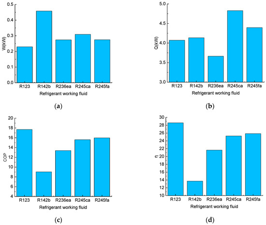 The simulation results are shown in Figure 13. The boundary conditions and mass flow rate used in the simulation are the same as in Section 3.1. The simulation results depict the performance of different refrigerants under optimal operating conditions. According to the results shown in Figure 13, R123 exhibits excellent performance in terms of total power consumption, coefficient of performance in heat pump (COP), and whole cycle energy efficiency. In particular, the COP of R123 can reach 17.69, and the whole cycle energy efficiency can achieve 28.61, both significantly outperforming those of other refrigerants. The low total power consumption (0.23 kW) and high whole-cycle energy efficiency (28.608) of R123 confirm its superior performance in heat pump systems. The low total power consumption implies that R123 consumes less electrical energy during operation, which contributes to reducing operational costs. This indicates that R123 provides high energy utilization efficiency and low operational costs in high-temperature heat pump systems.