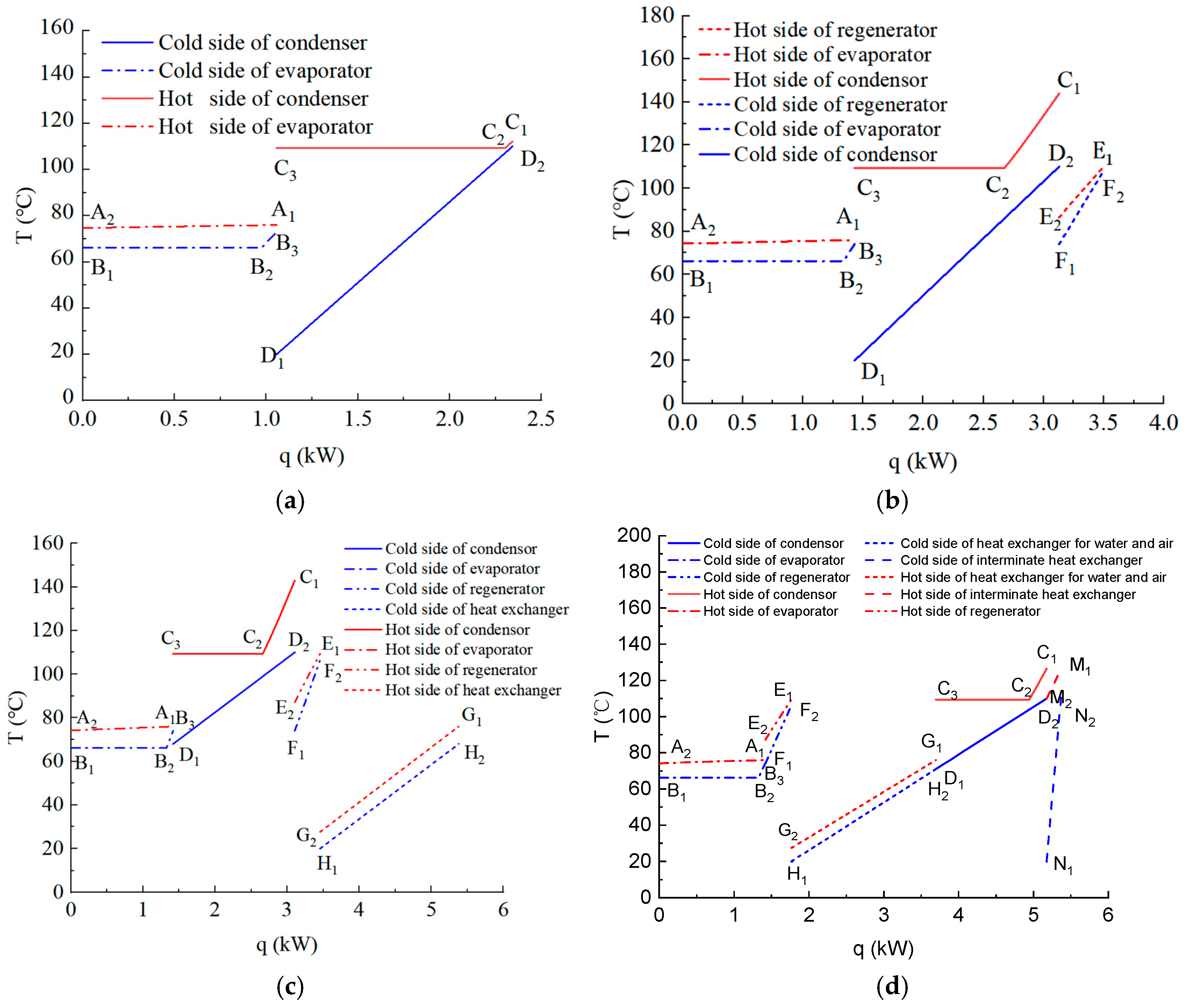 Figure 6a depicts the T-q diagram for MC/BHP/MPCC, which illustrates the relationship between the temperature (T) and heat transfer (q) for the fluids on both sides of the evaporator and condenser. The dashed-dotted lines on the left represent the cold and hot sides of the evaporator, while the solid lines on the right represent the cold and hot sides of the condenser. On the hot side of the evaporator, the mold cooling water releases heat of 1.06 kW, causing its temperature to drop from 76 °C to 74.7 °C (A1–A2). Simultaneously, the refrigerant on the cold side of the evaporator absorbs this heat, increasing its temperature from 66.19 °C to 73 °C (B1–B2–B3). Prior to the inflection point B2, the heat increases from 0 to 0.98 kW while the temperature remains constant, indicating that this phase is dominated by phase change, where latent heat is absorbed without a temperature change. From the inflection point B2 to the endpoint B3, both the temperature and heat increase simultaneously, suggesting that the refrigerant continues to absorb heat after completing the phase change, leading to a further temperature rise. On the hot side of the condenser, the heat of 1.29 kW is released, causing the refrigerant temperature to decrease from 112.16 °C to 109.40 °C (C1–C2–C3). Prior to the inflection point C2, both heat and temperature decrease. This phase represents the cooling of the refrigerant from a superheated vapor at a high temperature and pressure to a saturated vapor. From the inflection point C2 to the endpoint C3, the refrigerant transitions from a saturated vapor to a saturated liquid, with a decrease in enthalpy and a constant temperature. Meanwhile, the air on the cold side of the condenser absorbs this heat, increasing its temperature from 20 °C to 110 °C, which is suitable for material preheating and drying.