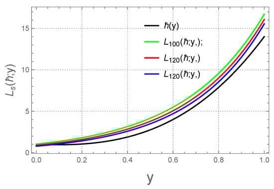 This section, we focus on examination of the convergence behavior of the operators defined in (4). The analysis is conducted for different values of m, specifically , , and . The convergence behavior is visualized in Figure 1, which highlights the impact of increasing m on the operator’s performance. Furthermore, the approximation error for these cases is illustrated in Figure 2, providing a clear depiction of the error trends.
