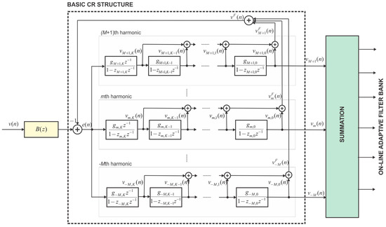 The CR-based structure consists of resonator cascades connected parallel and embedded in common feedback. The block diagram of the -type CR-based structure consisting of resonators serially connected in each of cascades is shown in Figure 1. Each cascade contains complex poles positioned on the unit circle, centered around the corresponding harmonic frequency. Associated with each resonator are complex gains , corresponding to poles . The closed-loop transfer function for harmonic is given by the following expression [3]: