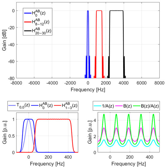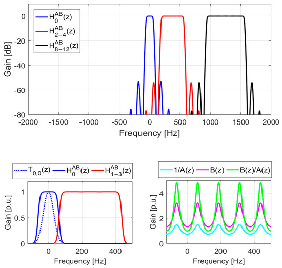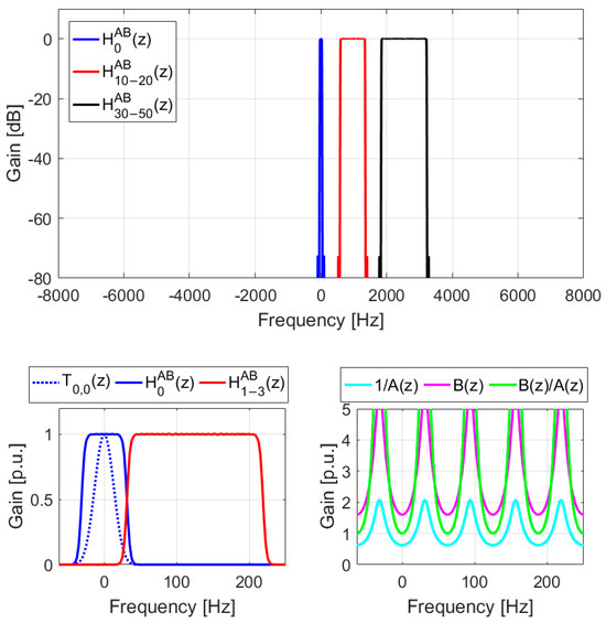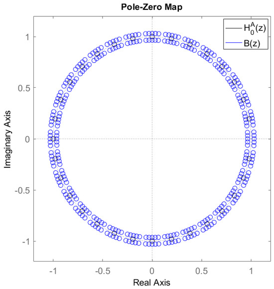 The first example (Figure 2) presents a type IIR CR-based filter bank, with , , and . The parameters are set as and . It is worth nothing that the ripples in the passband are minimal, with the maximum value of 0.02 dB. Figure 3 displays pole-zero maps of the transfer functions , and . The diagram clearly shows full periodicity, with the pole-zero-maps for other harmonic components able to be obtained by rotating this one. Note that for the harmonic (DC component), zeros around the pole (corresponding to frequency 0 Hz) are absent, whereas for the other harmonics, they are present with multiplicity of 5 (). Additionally, simulations indicate that setting , i.e., , is sufficient, as further increases do not yield significant improvements in design performance. Indeed, reducing does not reduce the computational burden during implementation; however, it decreases the number of optimization parameters, thereby shortening the design time. Unlike , increasing has a significant impact on performance improvement, particularly in reducing ripple in the passband. However, the downside is an increase in group delay .
