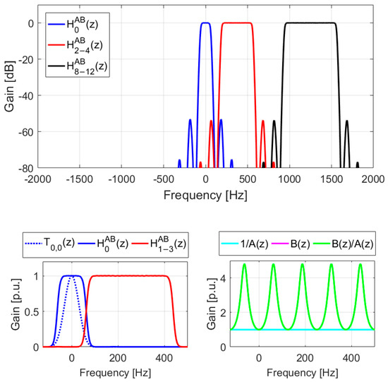 In the last example (Figure 7), with , , and , both and are selected as and . The maximum ripple in the passband is 0.02 dB. In this case, due to higher value of , the impact of the sidelobes of harmonic filters in the primary filter bank is negligible. The frequency responses of the filters and , shown in the inset figures at the bottom of the main figure, exhibit higher amplitudes compared to when . Additionally, it is evident that the analyzers with a higher number of resonators result in lower sidelobes and improved sharpness.