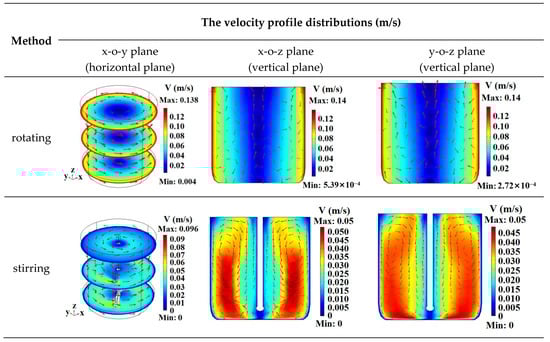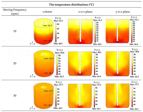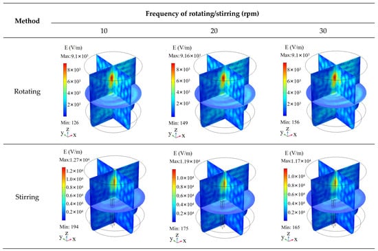 - The non-uniform temperature distribution of the water heated with the rotating turntable was primarily concentrated along the vertical plane, and the rotation had a very minimal effect on reducing the temperature difference. This characteristic of the temperature distribution was the result of the combined effect of the non-uniform electric field distribution and natural convection. In contrast, the temperature uniformity of the water heated with stirring improved because the forced convection enhanced the vertical flow of the fluid and effectively eliminated the vertical temperature difference. For the same rotational/stirring frequency, the COV of the water heated with a stirring paddle improved by 11.2–81.5% compared to that heated with rotation.