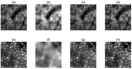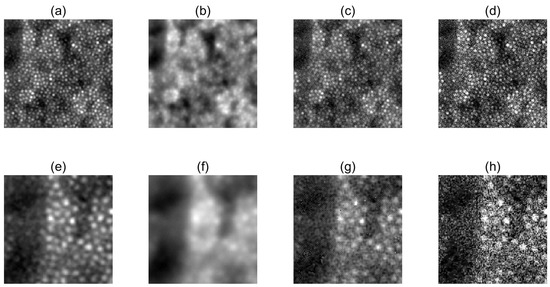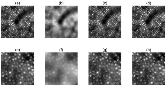 Results of AO retinal image restoration in Example 1. The BlurLevel of is set to ‘medium’. (a) True image; (b) degraded image; (c) restored image by the OGSTV model; (d) restored image by the TV model; (e–h) correspond to the enlarged segments of (a–d).