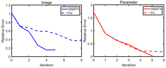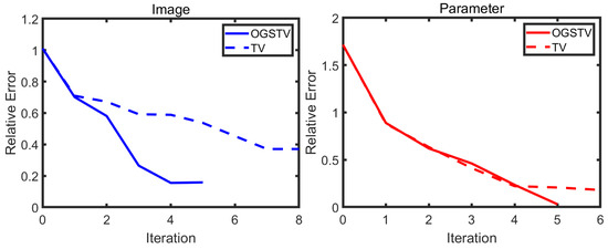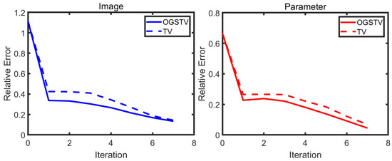 Figure 4 shows the relative errors of the reconstructed image and the estimated parameters against the number of iterations. As shown in Figure 4, although the TV model achieves a marginally lower image’s relative error at the fourth iteration, the OGSTV model demonstrates superior stability. Under identical stopping criteria, the OGSTV model attains a significantly smaller final error after additional iterations. Notably, the parameter estimation error of the OGSTV model converges to a negligible magnitude.