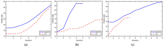 To evaluate the performance differences between the proposed OGSTV model and the TV model, we show the PSNR variations of both models during the iterative process across the above three examples. The corresponding curves of PSNR versus iteration numbers are shown in Figure 7. The results demonstrate that our proposed OGSTV model exhibits significant convergence and achieves higher PSNR levels compared to the TV model.
