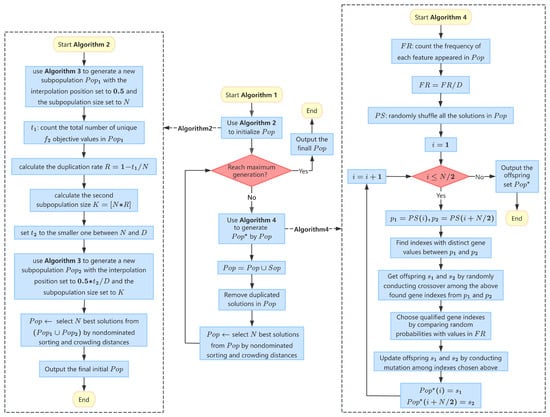 Algorithm 1 demonstrates the general framework of AIR, which inputs the population size N and the number of total features D as the initial parameters. It can be seen that the general framework of AIR is similar to other dominance-based MOEAs, but adopts the specifically designed methods for initialization and reproduction, i.e., the adaptive initialization method (AI) and the adaptive reproduction method (AR). Moreover, the environmental selection process has also been slightly modified by adding the removal of duplicated solutions in the current union population , as can be seen from Line 5 in Algorithm 1. Then, the truncation method uses the nondominated sorting and crowding distances, introduced in NSGA-II [] to reserve the best N solutions in for the next generation, as shown by Line 6 in Algorithm 1. The termination criterion of AIR is counted by the accumulated number of so-far evaluated objective functions, which is equal to the number of all the solutions generated during evolution. For the experiments carried out for this paper, the termination criterion was set to , meaning 100 generations of iterative evolution, representing a compromise between convergence and cost. A more intuitive overview of the proposed AIR algorithm is illustrated in Figure 1, with Algorithm 1, Algorithm 2 (invoking Algorithm 3), and Algorithm 4, respectively, specified in procedures. Furthermore, the two essential components of AIR, AI and AR, are, respectively, explained in the following two sections.