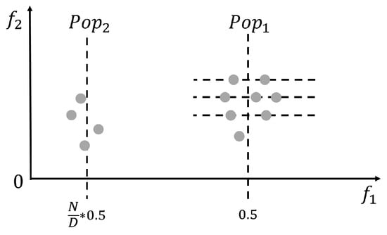 Figure 2 shows an example of how the proposed adaptive initialization method in AIR works when the population size is set as . At first, a subpopulation with the size of eight solutions is initialized, at the middle of the objective space, located around the interpolation position, i.e., . Here, acts as a normal subpopulation for sampling, whose solutions will be analyzed in the direction of for calculating the duplication rate R. As shown in Figure 2, has a total of eight solutions but only four unique values (i.e., ), making (i.e., ) in this case. Thus, a second subpopulation with the size of four solutions (i.e., ) is then initialized and located around the interpolation position of , with in this case. We assume that N is far smaller than D, which is rather common in high-dimensional cases, thereby making the interpolation position of distributed at the front of the objective space. Here, acts as a pioneer subpopulation for exploring more promising regions in the objective space, with relatively much smaller sizes of selected feature subsets. In this way, the hybrid initial population is made up of both the normal and the pioneer subpopulations, with an adaptively set ratio based on analyzing the duplication of solutions in the objective direction. This is quite reasonable because a more sparse feature space normally leads to more duplicated values, especially when the classification samples are also insufficient for those high-dimensional datasets, resulting in more necessity to explore the front regions in the objective space with smaller sizes of selected feature subsets.