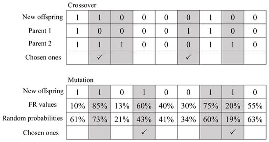 Figure 3 provides a brief example of how the adaptive reproduction process in AIR works, when the total feature number is set as . Here, all nine features are stored in the decision vector of each solution, with the value 1 meaning select that feature and the value 0 meaning not to select it. It can be seen that the whole reproduction process is made up of the crossover and mutation operations, which are, respectively, shown on the left and right sides of Figure 3. First of all, it should be noted that Figure 3 only demonstrates the corresponding new offspring for the first parent , while two bits indexed at the same positions are exchanged for crossover, i.e., swapping from 1 to 0 or from 0 to 1. Then, the resultant offspring is further mutated, with one bit swapping from 0 to 1, thereby finishing reproducing a new offspring. In Figure 3, bits that are qualified for crossover or mutation are painted gray for distinction, while whether to conduct the final crossover or mutation operation will also be chosen (denoted by ✓). In Figure 3, “Chosen ones” means that those identified genes are chosen for the crossover (i.e., Line 12 in Algorithm 4) or mutation operation (i.e., Line 19 in Algorithm 4). Moreover, it should also be noted that those genes are all chosen from the qualified genes by random probabilities. The crossover process in Figure 3 suggests that only distinct feature values are qualified in the crossover operation, which avoids invalid crossover. The mutation process in Figure 3 follows the adaptive mutation principle designed in Lines 13 to 20 of Algorithm 4, expecting that features with more appearances in the current population could have more chances to be mutated during reproduction. However, as can be seen from Figure 3, although the penultimate gene of the new solution has only a value, it can still be mutated (but certainly with a lower probability), which somewhat assures the fundamental diversity of those less frequently appearing features.