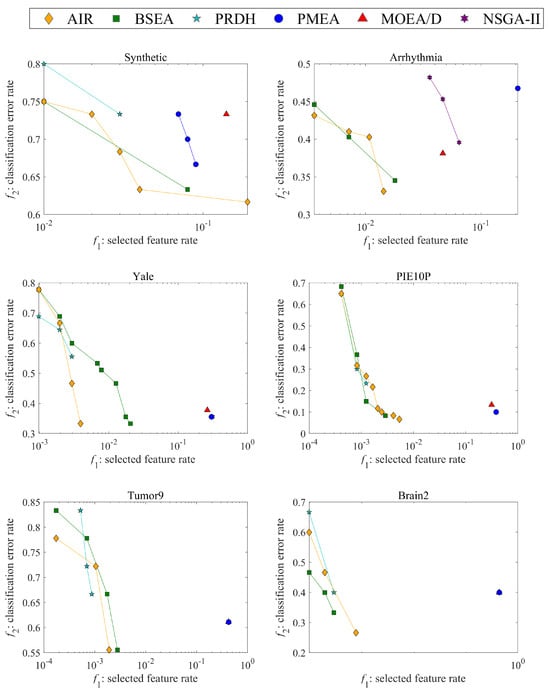 In this paper, a total of five state-of-the-art MOEAs are used as the algorithms to compare to the proposed AIR. They are BSEA [] (a bi-search evolutionary algorithm), PRDH [] (an MOEA based on problem reformulation and duplication handling), PMEA [] (a polar metric-based evolutionary algorithm), MOEA/D (an MOEA based on decomposition) [], and NSGA-II (an MOEA based on nondominated sorting and crowding distances) []. To be more specific, BSEA and PRDH are both the newest MOEAs specifically proposed for addressing the bi-objective feature selection problem in classification, while BSEA is based on the bi-search multi-task mechanism and PRDH is mainly based on the adaptive duplication handling of solutions. PMEA is an indicator-based MOEA using the polar metric, which can balance well both diversity and convergence performance during evolution. NSGA-II and MOEA/D are the two most classic and universal MOEAs, and are, respectively, based on the dominance and decomposition frameworks.