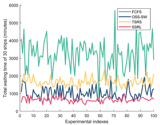 Table 2 details scheduling results for 30 ships arriving at the restricted waterway within one hour under ideal conditions (no uncertainties). The table presents the original ship information and the resulting ship sequences determined by three benchmark methods—TSRS [5], FAHP-ES [5], and OSS-SW [17]—alongside our proposed SSRL algorithm. These established methods were chosen as benchmarks because they specifically address the unique operational constraints of restricted waterways in the Yangtze River system. For the SSRL algorithm, we set and , meaning the algorithm considered the first 10 ships’ information while applying scheduling decisions only to the first 5 ships in each step. The results indicate that our SSRL algorithm generated the optimal ship sequence that significantly reduced total waiting times. To ensure statistical validity, we conducted 100 independent experiments under identical conditions (30 ships arriving in one hour with no uncertainties), with results shown in Figure 3. The proposed SSRL algorithm consistently achieved the lowest total waiting time with the smallest variance, demonstrating both superior performance and stability compared with conventional approaches.