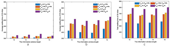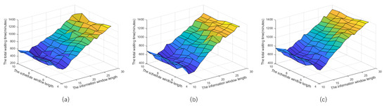 Figure 4 illustrates the total waiting time of 30 ships scheduled by the SSRL algorithm as a function of schedule window length () and information window length (), which varied from 5 to 10 and 10 to 30, respectively. Each data point represents the mean value from 100 independent simulations. Figure 4a shows the least congested scenario with 30 ships arriving over 180 min, Figure 4b depicts the moderately congested scenario with ships arriving within 120 min, and Figure 4c presents the most congested scenario with all ships arriving within 60 min. The color gradient from blue to red represents increasing waiting times.