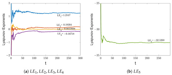 The Lyapunov exponents are an important measure of the orbital separation rate or instability of a dynamical system. In hyperchaotic systems, there are at least two positive Lyapunov exponents which correspond to the instability of the system in different directions. The Lyapunov exponential diagram of the system (2) is shown in Figure 2. The presence of two positive Lyapunov exponents indicates that the system is exhibiting a state of hyperchaos.