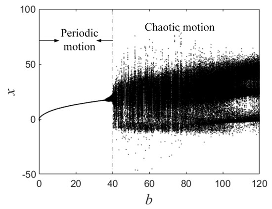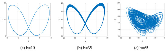The bifurcation diagram and Lyapunov exponential diagram of the system (2) at are shown in Figure 3. When , the system shows chaotic behavior. As the parameter increases, two positive Lyapunov exponents can be observed in the Lyapunov exponential diagram, so the system is hyperchaotic. The bifurcation diagram of system (2) with the parameters and is shown in Figure 4. When , the system exhibits periodic motion. When the value of b increases to 40, the system (2) exhibits chaotic behavior. The phase diagram of the system (2) in the plane when we take , respectively, is shown in Figure 5. The systems in Figure 5a,b show periodic motion, and in Figure 5c the system shows chaotic motion.