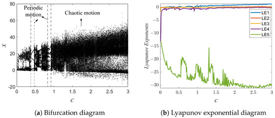 Consider the effect of parameter c on the system. Figure 6 illustrates the bifurcation diagram and Lyapunov exponential diagram when the parameter c is varied. We find that when , there are periodic windows in the bifurcation diagrams, such as and , and the system will experience periodic motion. It is clear that when , the system will enter a chaotic state. As shown in Figure 7, the system is in periodic motion at and and exhibits chaotic motion when .