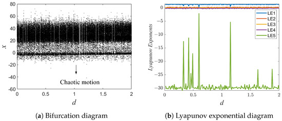 In addition, we consider the effect of the parameter d on the system. When d is changed from 0 to 2, fixing the other values, the bifurcation diagram and Lyapunov exponential diagrams are as shown in Figure 8. It is seen that there is minimal impact of the parameter d on the system. The system remains in a chaotic state. Therefore, small changes in the parameter d do not significantly change the overall behavior of the system.