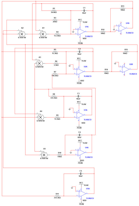 Based on the dimensionless equation of state, the corresponding chaotic circuits are designed using modular design concepts. The variable scale compression transformation is the first step. The operational amplifier has a linear dynamical range of V. We note that the hyperchaotic system’s state variables are outside of this range. Therefore, we must alter the state variables by compression. After the time scale transformation and letting , the state equation for the circuit simulation is as follows: