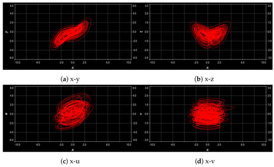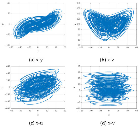 The states of motion of hyperchaotic systems are usually characterized by highly complex and unpredictable trajectories in phase space. These trajectories may fill a finite region of the phase space but in a very irregular and chaotic manner. The parameters are set as and along with the initial condition of (1, 1, 1, 1, 1). The phase diagram in the , , and space of the system (2) is depicted in Figure 1. We can observe chaotic attractors.