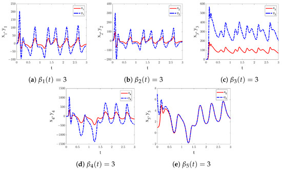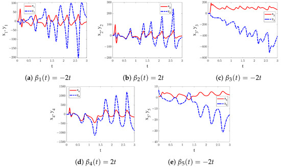 The following values are taken for the system’s parameters: , and . The controller’s parameters are set at and . It is assumed that the initial conditions of the drive and response systems are and . To analyze the function projection synchronization implementation, we carried out three sets of numerical simulations. The selection of the projection scale factor causes the main difference between the three sets of numerical simulations. In the following, we select three different values. We discuss the implementation of function projection synchronization by examining the error timing diagrams and the timing diagrams of the state variables.