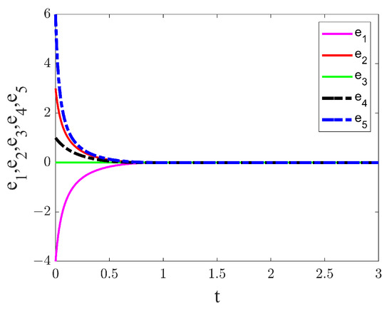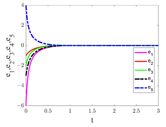 (3) If is defined as a function dependent on t, function projection synchronization is attained. When we take and , hybrid function projection synchronization is achieved. denotes projection along the negative direction with the projection relation increasing linearly with time; is projected along the positive direction and increases linearly with time. The timing diagram for synchronization of the state variables is displayed in Figure 17. The synchronization error variable approaches zero as Figure 18 illustrates.