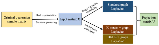 Our proposed method for deriving the projection matrix U, as detailed in the flowchart shown in Figure 1, comprises three fundamental components. The processing pipeline begins with the encoding of input color images as pure quaternion matrices, and these matrices undergo an isomorphic transformation to their real representation, preserving the complete quaternion algebraic structure through block matrix representation. Subsequent dimensionality reduction is achieved through strategic extraction and vectorization of the principal column block, yielding the final data matrix. For the second component, we implement a sophisticated dual-graph framework through two methods. Among them, the KNN graph serves as a standard method for constructing the graph Laplacian matrix. In contrast, the anchor techniques we employ here, namely K-means and the BKHK method, function as acceleration strategies. Finally, the complete model is solved through the ADMM to obtain the projection matrix U, which will be elaborated upon later.