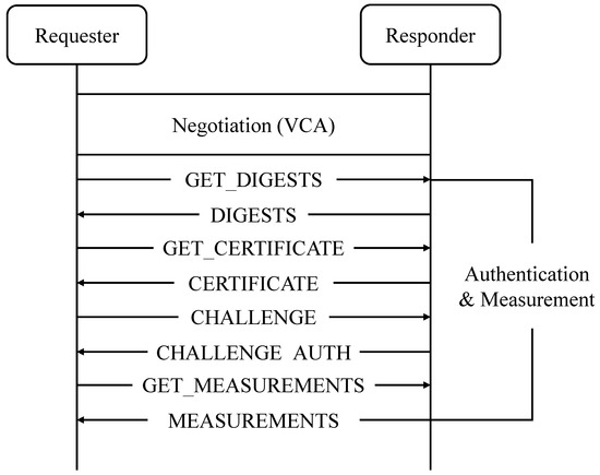 - The device attestation phase. In this phase, SPDM focuses on verifying the identity of the device and ensuring the integrity of its firmware and hardware configuration. They exchange messages as follows: