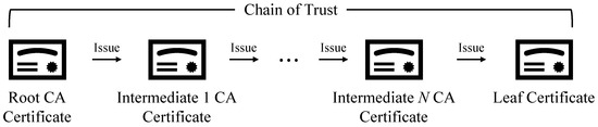 X.509 certificates [7] are a widely used format for public key infrastructure (PKI) and play an essential role in authenticating entities in web environments. As shown in Figure 2, X.509 certificates follow a hierarchical trust model, where each certificate is signed by a Certificate Authority (CA). Each certificate in the chain is verified using the public key of its upper certificate, continuing until the root CA certificate—a self-signed certificate—is reached. If the root CA certificate is in the trust anchor of the verifier, it eventually trusts the leaf certificate.