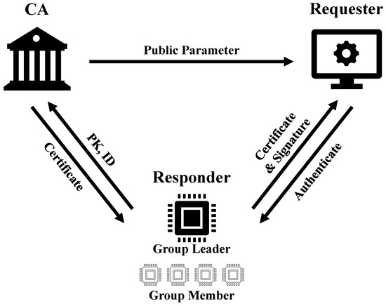 - Responder. The responder sends the information required for authentication to the requester. As shown in Figure 3, each responder obtains a certificate from the CA corresponding to its own key pair. In our scheme, responders can be categorized into group leaders and group members depending on their roles.