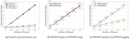 In Figure 6a, SPDM-Origin and SPDM-Group incur significantly higher communication costs than those for SPDM-Chainless and SPDM-AggSig as the number of devices increases. This difference is primarily due to the certificate size, which plays the most significant role in the communication overhead. While the cost of signature generation remains similar across the schemes, the larger size of the X.509 certificates in SPDM-Origin and SPDM-Group leads to substantially higher communication costs compared to those with the compact chainless certificates used in SPDM-Chainless and SPDM-AggSig. As observed in Figure 6b, SPDM-Origin produces slightly higher costs than those for SPDM-Group due to the initial negotiation message () being broadcast to all of the responders, affecting the communication overhead. In Figure 6c, SPDM-AggSig outperforms the others by aggregating both the certificate proofs and signatures, significantly reducing the communication costs. As a result, SPDM-AggSig offers the most efficient communication cost, achieving an approximately 96.22% decrease in the communication overhead, making it highly scalable for large-scale deployments.