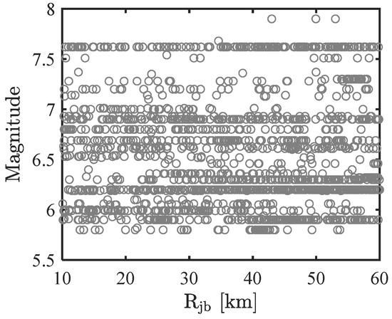 Ground motion records were selected from the PEER strong ground motion database to establish the ground motion record set and to derive the seismic fragility curve. The earthquake magnitude M and epicentral distance R were constrained to the intervals 5.8 ≤ M ≤ 8 and 10 km ≤ R ≤ 60 km. A total of 1724 pairs of horizontal ground motion records were selected within this range. The ground motion records in one direction were used as training dataset, while those in the other direction were used as test dataset. Figure 2 illustrates the earthquake magnitude and epicentral distance distribution for ground motion records utilized in seismic fragility analysis.