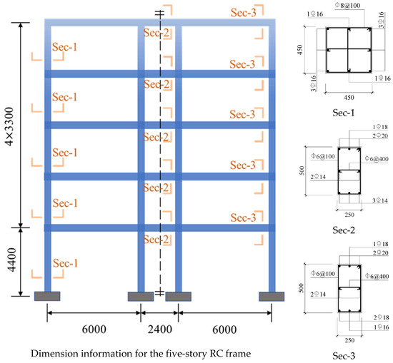 In this paper, structural models of four reinforced concrete frame structures with different numbers of stories [53] were constructed according to the Chinese seismic design code for nonlinear dynamic analysis. The four constructions consisted of three, five, eight, and ten stories, with the first floor measuring 4.4 m in height and the subsequent stories each measuring 3.3 m. The side span measured 6 m, while the central span measured 2.4 m. The distance between frames in the perpendicular direction was 6.0 m. In this paper, the middle one-bay planar frame was selected as the research object and the structural response was obtained by modeling and analyzing using finite element software OpenSees (version 3.2.2) [54]. The beams and columns of the structure were made of C30 concrete and the longitudinal reinforcement was made of HRB335. The influence of infill walls and slabs was not considered and the beam-column joints were not specially defined, but were treated as solid joints. Using the five-story reinforced concrete frame construction as a case study, Figure 3 shows the dimension information and cross-section reinforcement of the application case. The distinction between the other structures and the five-story structure was in the number of stories, regarding building dimensional specifications.