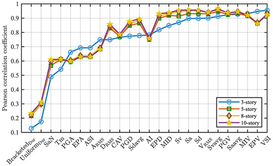 The correlation coefficients between each IM and EDP are illustrated in Figure 10. Figure 10 depicts the Pearson correlation coefficients between various IMs (Sa, Savag, VSI, and ) and seismic demand parameters (EDPs) across different structures. For the three-story structure, the Pearson correlation coefficients of Sa, Savag, VSI, and with EDPs all exceed 0.85, with exhibiting the highest correlation. Similarly, in five-story, eight-story, and ten-story structures, the correlation coefficients of Sa, Savag, Svvag, VSI, and with EDPs exceed 0.9, where consistently demonstrates the strongest correlation. Significantly, it has the strongest correlation among all IMs across various structures, highlighting its strong association with EDPs. The primary reason lies in the compound nature of , which encapsulates more effective information relevant to structural demands, therefore forming a robust and durable association with EDP across four distinct structures.