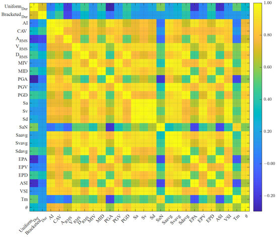 Applying too many features of ground motions directly to regression analysis may lead to model complexity and diminished predictive performance, hence necessitating feature selection. The Pearson correlation coefficient is a prevalent metric for assessing the strength and direction of linear correlations between two continuous variables, commonly utilized in feature selection. The coefficient (designated as R) ranges from −1 to +1: values approaching +1 signify a robust positive correlation (i.e., both variables increase concurrently), whereas values nearing −1 denote a strong negative correlation (i.e., one variable ascends as the other descends). An R value of 0 indicates the absence of a linear correlation between variables.