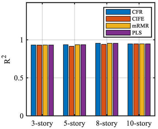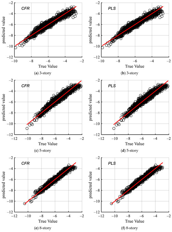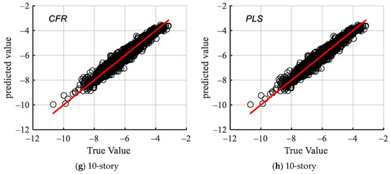 After employing the CFR mutual information method for feature selection, subsets of features were determined for four structures based on mutual information indices. Based on the results of each structure’s feature selection, a set of 1724 ground motion records in a certain horizontal direction was selected as the training set to construct a multiple linear regression (MLR) model, while another set of 1724 records served as the testing set to compare regression errors. Figure 6 presents scatter plots of predicted versus observed values in the test sets for three-story, five-story, eight-story, and ten-story structures, with the x-axis indicating actual values and the y-axis representing predicted values. Additionally, Figure 7 displays the R2 results for the MLR model, assessing the predictive accuracy of logarithmic seismic demand parameters.