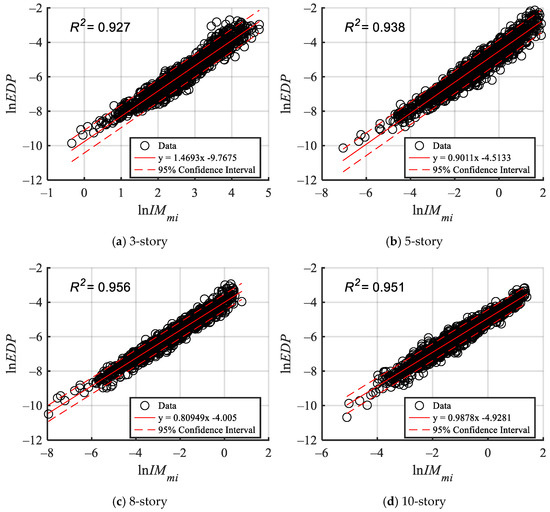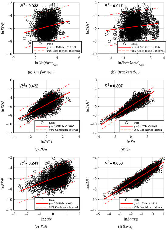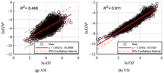 Selecting a compound IM can enhance the prediction of structural EDPs. In order to further investigate the applicability of the compound IM, probabilistic demand analysis is performed on the nonlinear response results of the three-story structure. According to Equation (17), a linear regression analysis of the compound IM and EDPs is performed to establish a probabilistic demand model. Simultaneously, as a comparison, the probability demand models of other scalar IMs are also established. These scalar IMs include the scalar IMs that constitute the compound IM, as well as other commonly used scalar IMs such as PGA and Sa. The scatter plots and fitted straight lines of the EDP and the corresponding multiple IMs are depicted in Figure 8 and Figure 9. In addition, the regression line equation and the 95% confidence interval are shown in the bottom right of the figure, while the goodness-of-fit value is presented in the top left corner. The goodness-of-fit is a crucial index for evaluating the efficacy of a linear regression model, which measures the degree of fitting of the model to the data. The coefficient of determination serves as the indicator of quality of fit in this context. The coefficient of determination indicates that the fitting quality of derived from the mutual information approach is better than that of the other IMs. Specifically, performs marginally better than the best scalar IM, the VSI, which has the highest fitting performance among all scalar intensity measures.