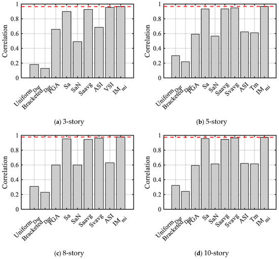 Correlation of and other scalar parameters with engineering demand parameters (maximum inter-story drift ratio, ; The red dotted line represents the value of ).