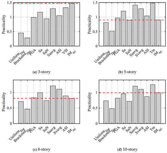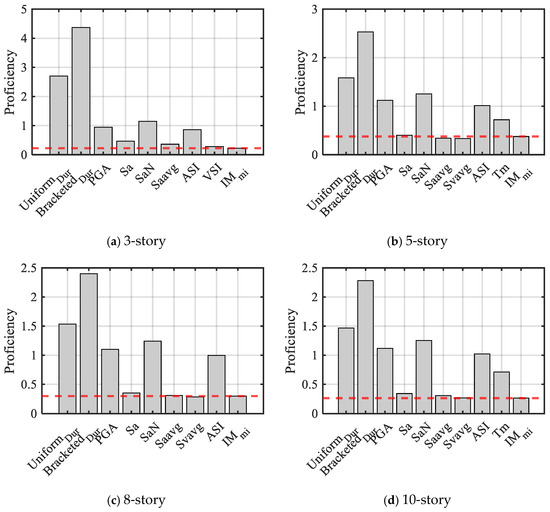 To mitigate potential biases or contradictions from evaluating effectiveness and practicality separately, proficiency has been proposed as an evaluation criterion that combines the advantages of efficiency and practicality [57]. Proficiency is defined as the ratio of efficiency to practicality b, according to Equation (18). Typically, a more proficient IM indicates a reduced modified dispersion, which represents the degree of EDP’s uncertainty.