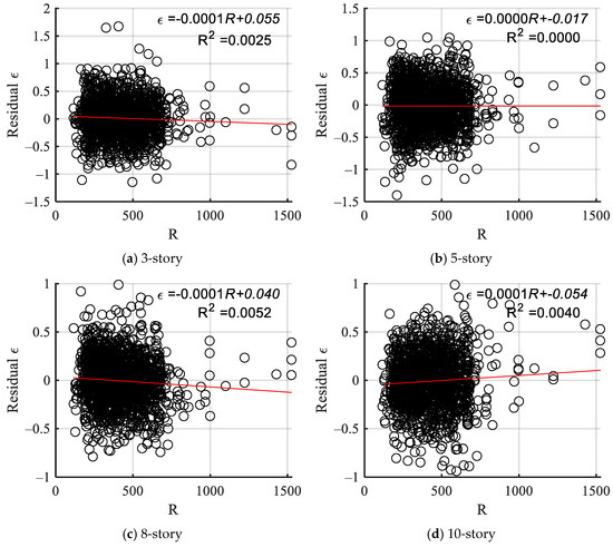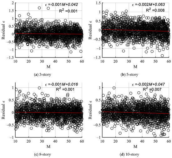 Linear regression of residuals of the four structures with respect to the epicenter distance R was performed, and the linear regression results are shown in Figure 15. The goodness-of-fit for the fitted lines of the residuals of the four structures in relation to the epicentral distance R is below 0.01, indicating a lack of significance, whereas the goodness-of-fit for the fitted line of the five-story structure approaches 0. The absolute values of the slopes of the fitted lines of the residuals for the four structures with respect to the epicentral distance R are close to 0, which indicates that variations in the epicentral distance R have a minimal impact on the residuals’ results. The results indicate that the magnitude M and the epicenter distance R exert minimal influence on the residuals, suggesting that is independent of both the magnitude and epicenter distance with satisfactory sufficiency.