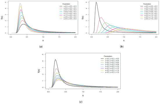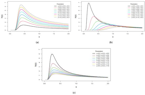 The plots in Figure 1a–c illustrate the PDF plots when changing one of the parameters and fixing the others. Figure 1a,c show different potential PDF shapes for the M-O-EIR distribution for various values of the shape parameters and . It is obvious that the distribution is unimodal and right skewed, which is suitable in modeling asymmetric data. In Figure 1b, when the scale parameter increases while the shape parameters and are fixed, the distribution expands to the right and its peak decreases. The plots in Figure 2a–c demonstrate the behavior of the HRF for the M-O-EIR distribution. It is observed that the hazard rate function increases and then decreases with time, which is highly beneficial in survival analysis.