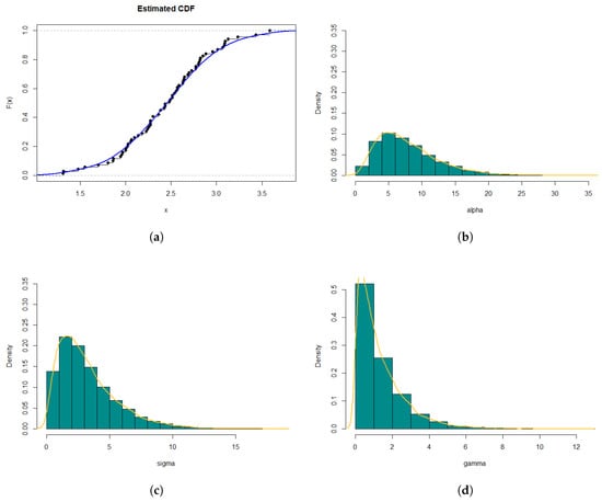 (a) Estimated and empirical CDFs, (b–d) posterior densities of , , and for the first dataset.