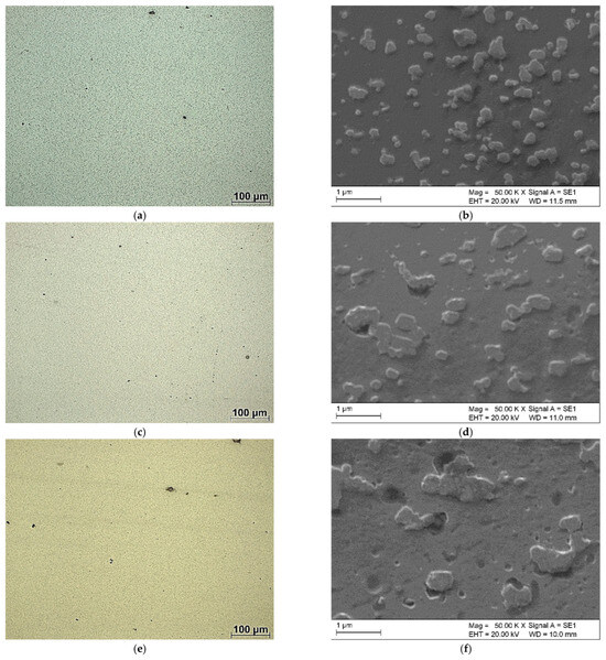 A consistent and high-quality surface finish for microstructural analysis was achieved by subjecting all specimens to a standardized metallographic preparation procedure. This procedure was performed using a LaboPol-20 automatic polishing device (Struers, Copenhagen, Denmark) and commenced with grinding using 800 and 1200 grit silicon carbide (SiC) papers under running tap water. Subsequently, the samples were polished using diamond suspensions with particle sizes of 6 µm, 3 µm, and 1 µm. The final polishing step involved mirror-polishing with a 0.04 μm colloidal silica suspension (OP-U suspension, Struers, Copenhagen, Denmark) for a duration of one hour.