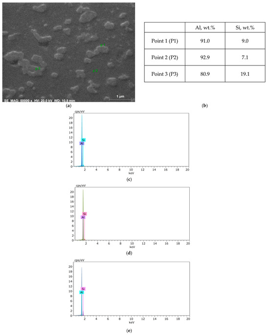 A microstructural analysis following extrusion revealed significant fragmentation of the Al-Si eutectic network. The AlSi10Mg alloy sample subjected to conventional extrusion at 350 °C (CE-350) exhibited the smallest average Si particle size, approximately 0.18 μm2 (Figure 3a,b). In contrast, the room-temperature KOBO-processed sample exhibits a microstructure with Si particles of an intermediate average size of approximately 0.34 µm2 (refer to Figure 3c,d). The KOBO extrusion performed at 350 °C creates a microstructure with the largest Si particles among the three conditions, measuring approximately 0.47 µm2 (refer to Figure 3e,f). To chemically verify the identity of the measured particles, an EDS microanalysis was conducted. The results of this analysis, presented in Figure 4, confirm that these microstructural features are silicon precipitates.