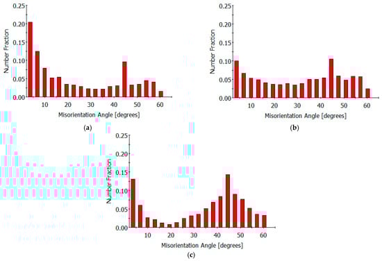 The KOBO-RT sample microstructure is dominated by HAGBs, accounting for approximately 63.6% of the total boundary length fraction (excluding twins) (Figure 6b). In addition, this sample possesses the highest fraction of twin boundaries of ~9.4% (Figure 7b). It appears that the unique strain path in the KOBO process promotes development of grains with higher misorientations (specific orientation relationships with the parent matrix grains), likely due to enhanced grain rotation and boundary migration during deformation. These grains can be observed predominantly at the boundaries of the elongated grains. The presence of more “green” grains in the KOBO-RT sample indicates the development of a stronger deformation texture (Figure 6b).