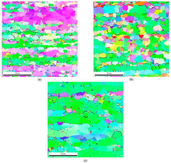 In the next phase of investigation, electron backscatter diffraction was employed to characterize the grain microstructures of the extruded samples. The EBSD inverse pole figure (IPF) maps are presented in Figure 5. It is important to note that these maps exclusively identify the Al phase, as indexing Si using EBSD is technically challenging due to the close similarities between the diffraction patterns of Al and Si phases. It should also be noted that the microstructure of the as-built LPBF samples was characterized in a previous study [21].
