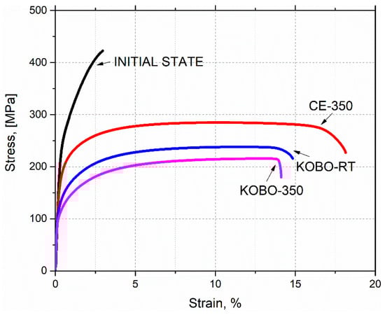 While the above described factors collectively enhanced ductility, the specific strength–ductility balance achieved varied significantly, correlating with microstructural features reported in this study. All extrusion processes induced a characteristic (101)//TD texture, known to influence deformation anisotropy [61]; notably, this texture was more pronounced in the KOBO-RT sample compared to CE-350. However, the dominant factor explaining the variations in measured strength across the conditions was the final grain size. The CE-350 sample, combining the finest grain width (~1.9 µm) with the strong (101)//TD texture, exhibited the highest yield strength and overall best property balance. Conversely, despite also developing a fiber texture, the substantial grain coarsening (~6.3 µm) in KOBO-350 led to the lowest strength. The intermediate grain size (~3.4 µm) and stronger texture of KOBO-RT yielded intermediate properties. Thus, while the development of texture is integral to the extrusion process and affects deformation pathways, grain size refinement appeared paramount in controlling the strength levels observed in this comparative study.