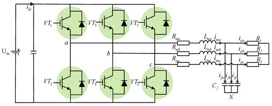 From Equations (3) and (4), it can be seen that the rotation transformation introduces coupling between the d-axis and q-axis of the system, and the currents and are not only controlled by the control quantities and ; they are also affected by the inductive coupling voltages and and capacitor voltages and . Similarly, the output voltages and of the d-q axis of the system are not only controlled by the output inductance currents and , but they are also affected by the disturbance of the coupling currents and and the load currents and .